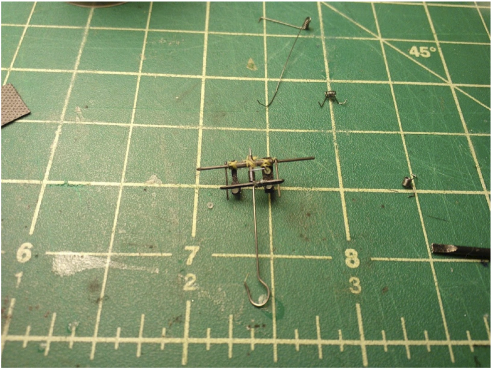 Spring is 9.5 turns of .008” music wire formed over a .025” mandrel. Here, prop shaft is .013” music wire.
