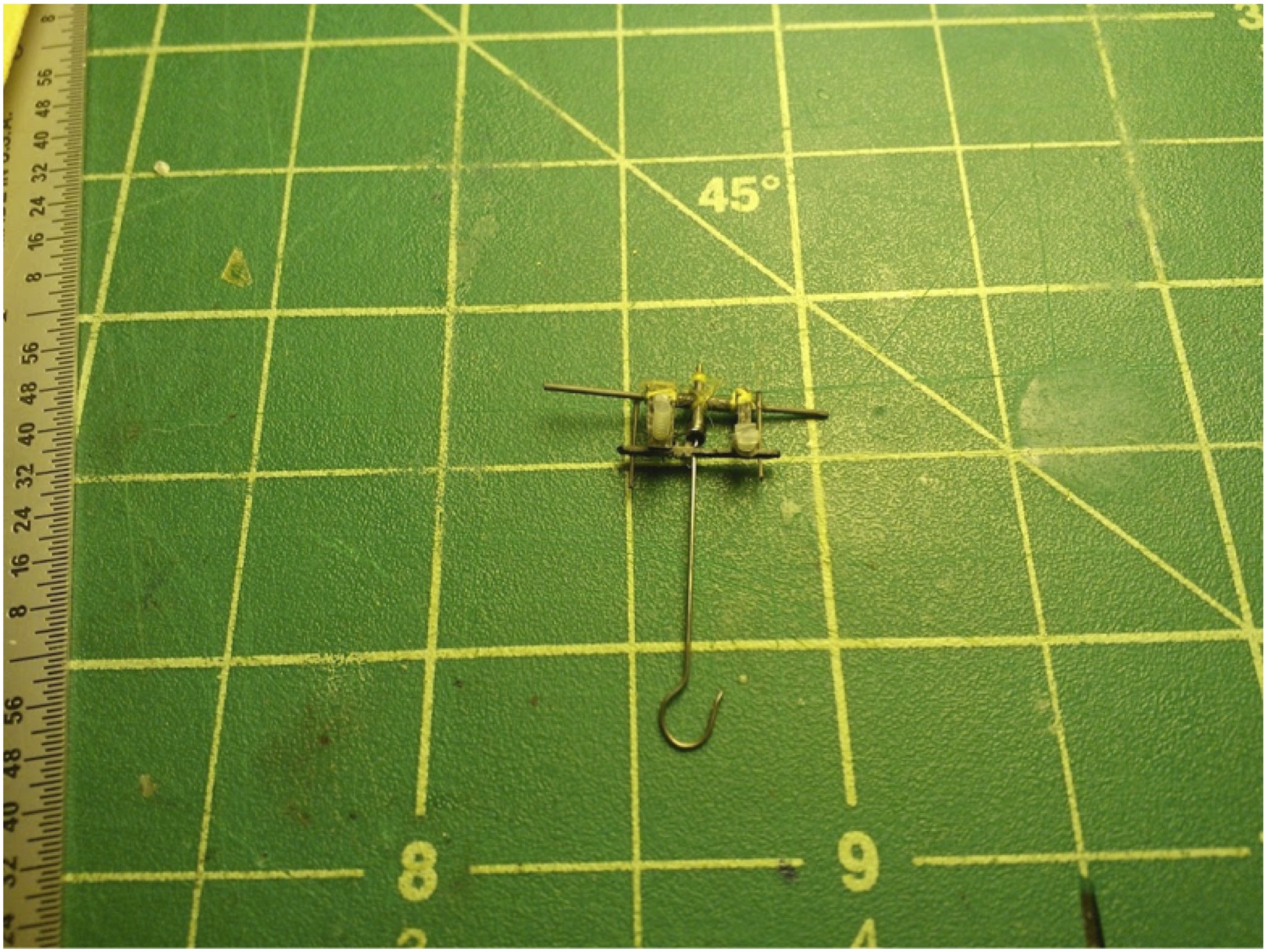 Carbon tube “hub” before prop shaft sleeve hole is drilled. The lever arm is glued to the spar “rod” using thin CA. Only tack gluing is needed. The lever arm is later securely glued to the end of the prop spar.