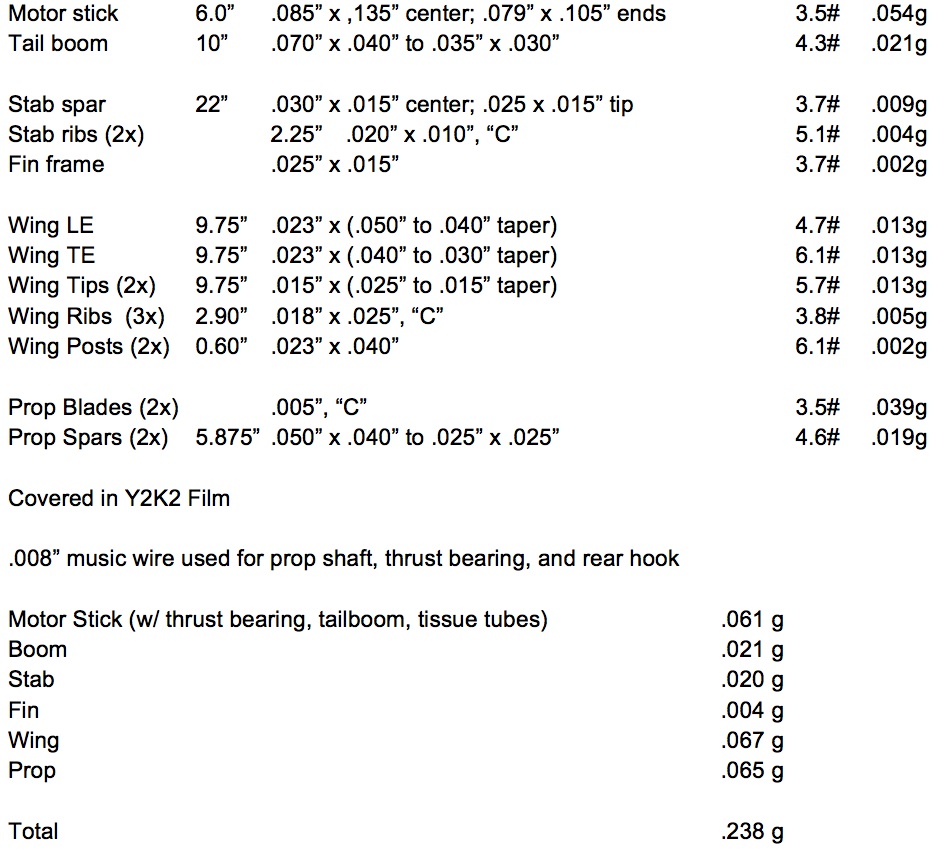 All the balsa on this model came from A2Z, with the exception of the prop wood from Jeff Hood.  The Y2K2 film used to keep the flying surfaces light was generously given by Mark Bennett.  Finally, the 7/99 Tan II rubber, although not super like 5/99, was good enough.  It was purchased from the estate of the late Fred Behrenberg, an indoor flier from the Philadelphia area.  Fred — thanks for keeping the rubber in good shape all those years.