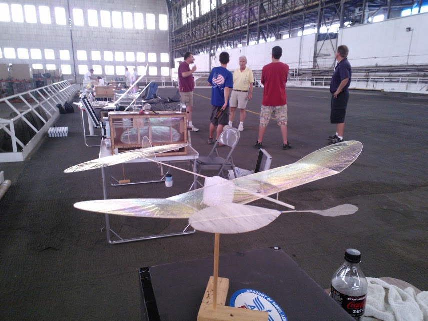 Fast forward to the 2012 Labor Day weekend at Lakehurst, New Jersey.  It was around 7:15 pm and getting dark inside Hangar 1.   The model launched without fuss and climbed steadily, reaching its peak in about 10 minutes.  My lucky charm, Rob Romash, was on the clock.  Brett Sanborn and John Kagan were also on hand to give moral support.  We took turns with the flashlight to keep the model in sight.   It was too dark to determine the peak height of the model, but I think it was 170’, 5’ below the ceiling.  It stayed at its peak for a very long time.   With a very slow descent, it broke the previous record of 35:01 at around 30 feet.  It finally landed at 37:48, after an uneventful, yet thrilling, no-touch, no-steer flight.