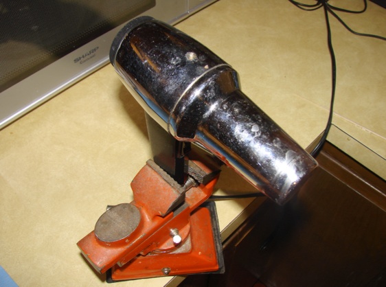 I have been doing a little experimenting on an easy way to form balsa around a tight curved outline. I used a hair curling iron mounted in a small table vice or you can duck tape the handle to a table. The barrel must extend past the end of the table, and set it on its highest temperature. When a drop of water sizzles, it’s ready. To practice, take a sheet of .025.-.030 balsa, 4-5# and strip several square pieces. Make up a balsa template of the outline and pin it to a building board. Lay several pieces of the stripped wood on a counter top and puddle water on each side of the strips and let them soak for about five minutes or less. At the half way point of the balsa strip, lay it over the curling iron and pull down on each leg so that it forms a ninety degree bend.  You will be able to hear the wood sizzle for a second and let it remain on the iron for about five seconds. You can roll the wood back and forth to make a larger arc or use another heating device that has a larger diameter. Use the heat gun with extreme caution and do not move your hand in front of the nozzle while it is on.  As soon as the wood is removed from the iron, move it over to the template and trap it against the template using pins and small balsa wedges.