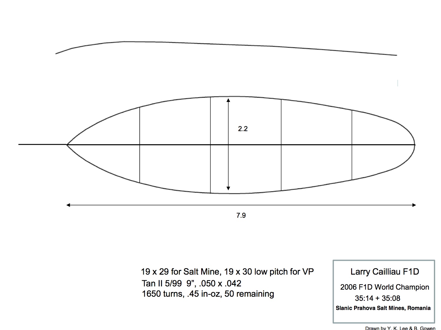 The summer of 2006 was spent trimming five models for the salt mines. I remember Jim Richmond telling me that I needed to climb about 75ft. on a quarter motor, which would be equivalent to salt mine conditions. At Champaign, I tried for two days experimenting with different props and trim setups. However, I was unable to achieve this. I again consulted Jim and he told me that a 19” 29p prop would get me up. When the all-time world’s best speaks, I listen!