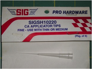 The nozzle can be replaced with the Sig CA applicator tip shown below. You will need to cut both ends to get a tight fit around the wire and the aluminum tube. Do this a little at a time so you don’t waste more than one tip like I did! The Sig nozzle seems impervious to acetone and never develops a leak.