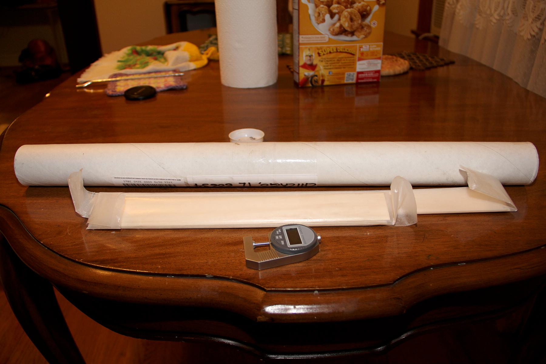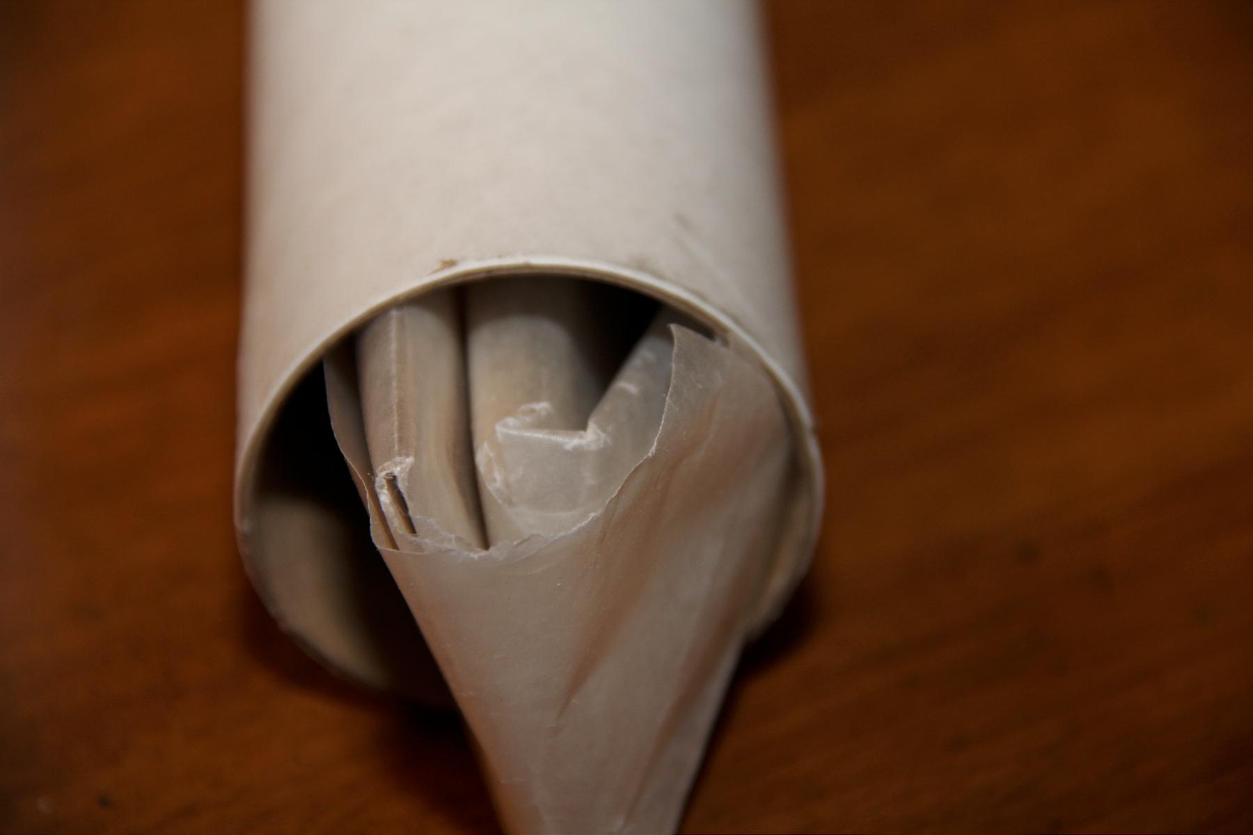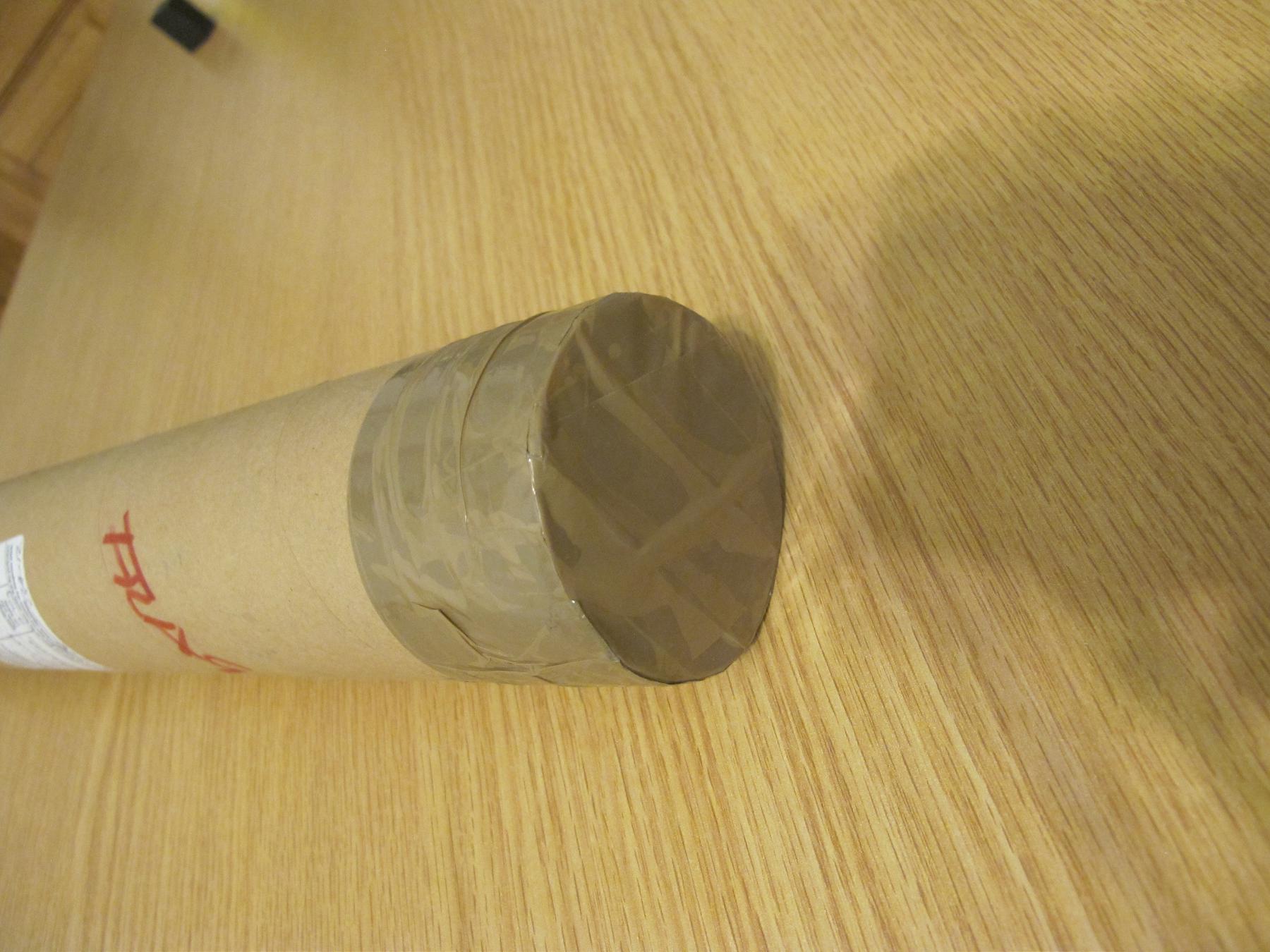 The packaging states clearly ‘Open Here’. Two bits of tape hold the end cap in the paper tube. I shake it a bit and hear the balsa moving around. I opened it up and find the balsa separated – Four sheets of wing spar wood wrapped together and the tapers wrapped separately in what appears to be wax paper.
