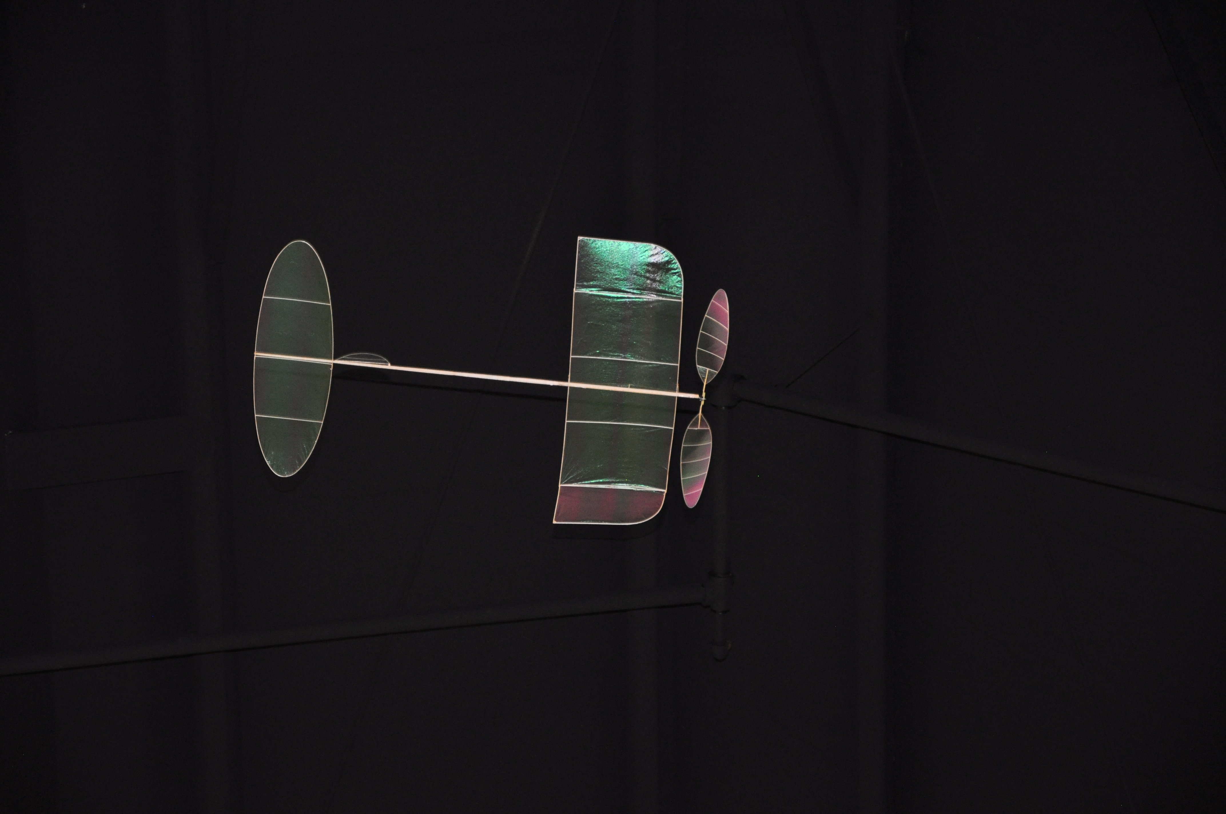 Flight notes: On the previous flight, the model hung up on the plastic surrounding the saucer, and during retrieval the left hand wing tip was broken and a hole was put in the center section of the wing. The record flight was launched five minutes before the contest was over. There was no time to test fly after repairs. Again, the model played tag with the bottom of the saucer and the plastic on the opposite side from where it had hung up before. It did not touch the girder work. Only one pole steer was required to miss a chair before landing.