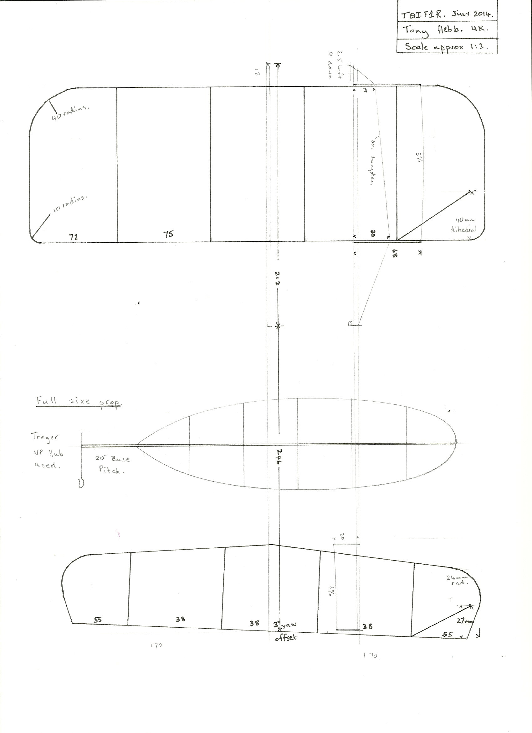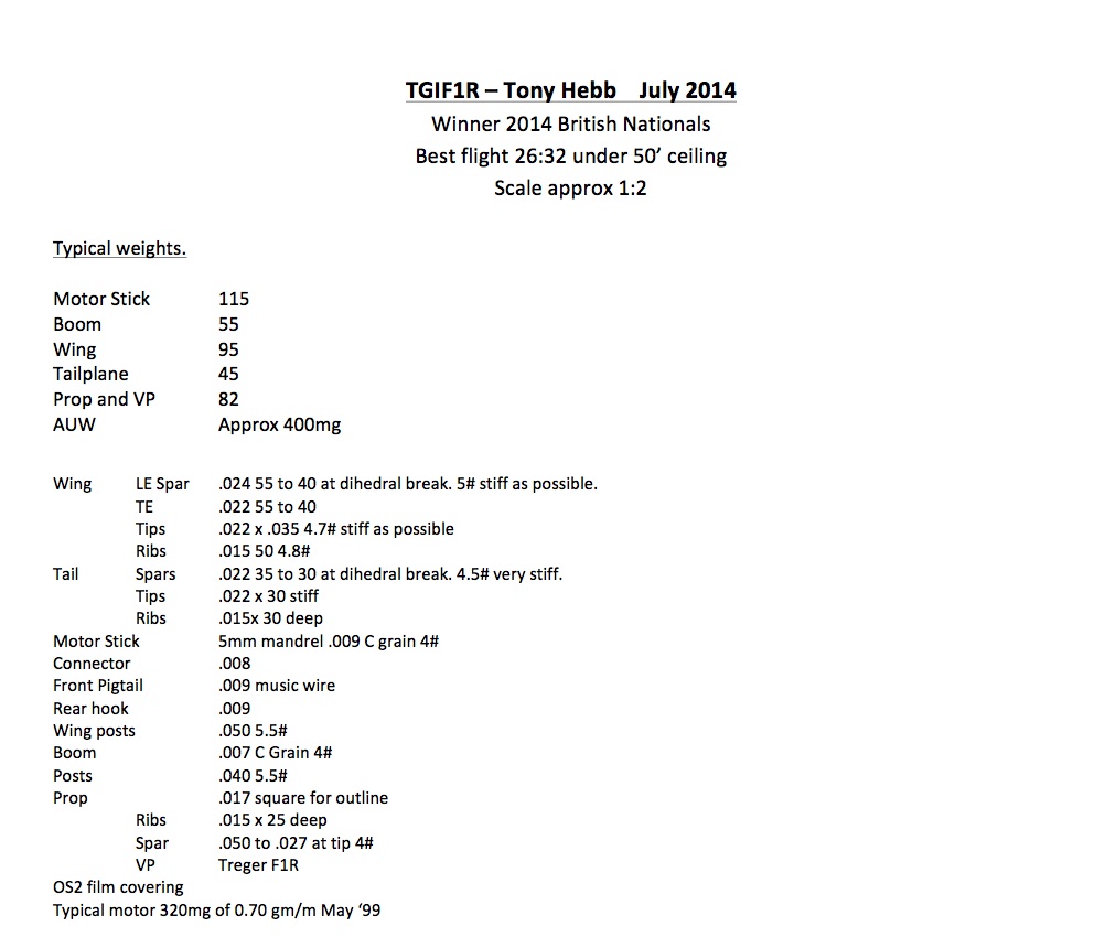 The model is really Bob Bailey’s F1R with slightly simpler wing and tail outlines, also Bob flew with his own VP hub whereas mine flies predominantly with a Treger F1R hub which I can wholeheartedly recommend.